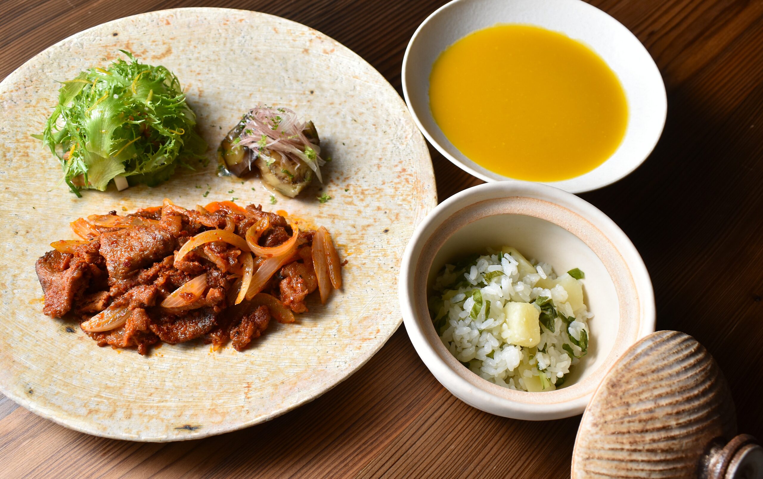 豚肉のラグー、クスクス、法連坊柿の干し柿、自家製塩すだち