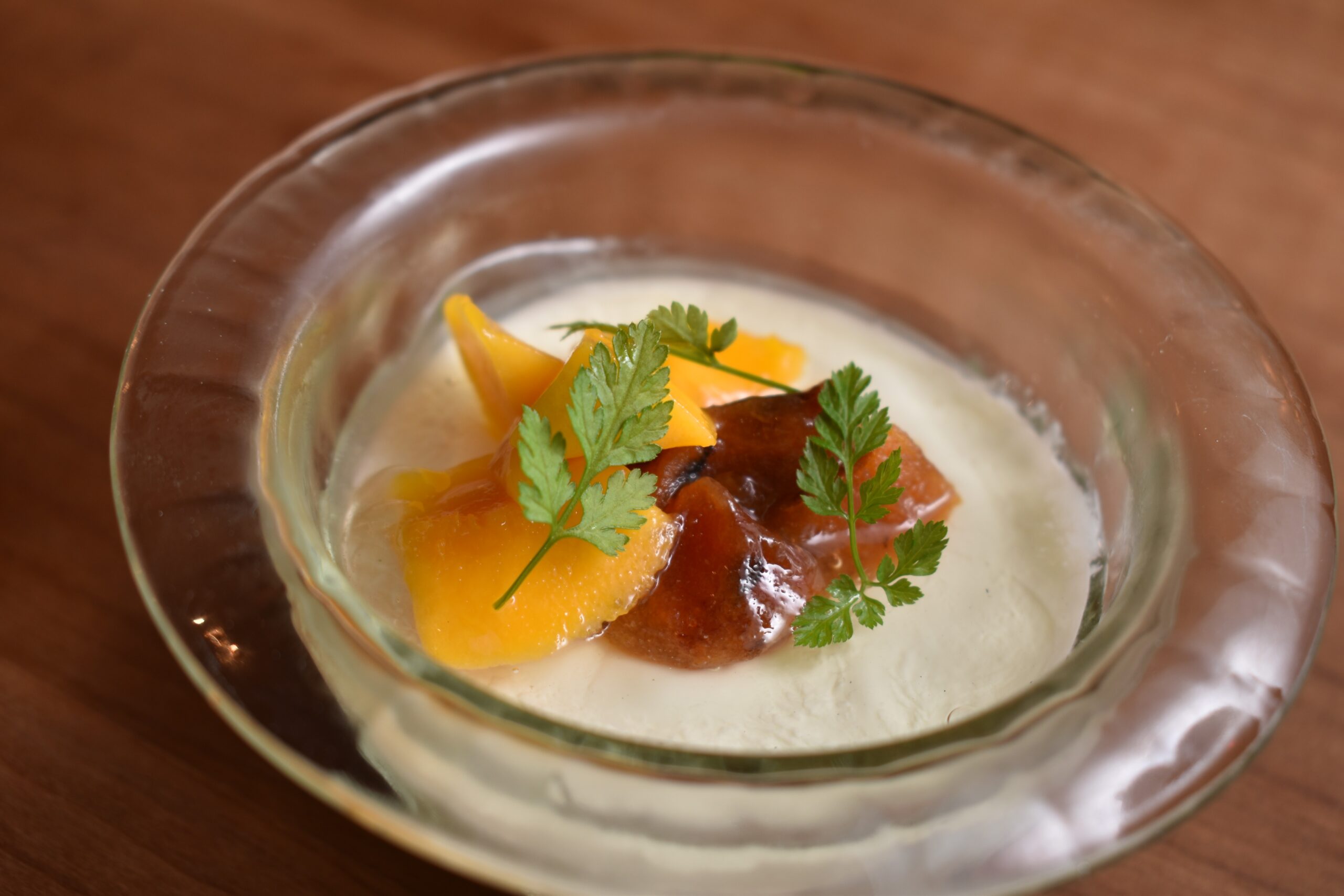 干し柿、柿酢のソース、白ワインのジュレとマンゴー